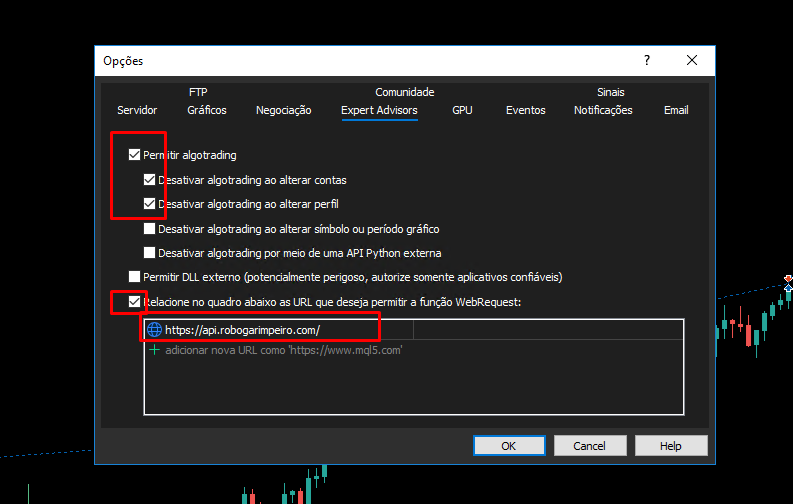Marque a caixa: "Permitir WebRequest para os URLs listados".